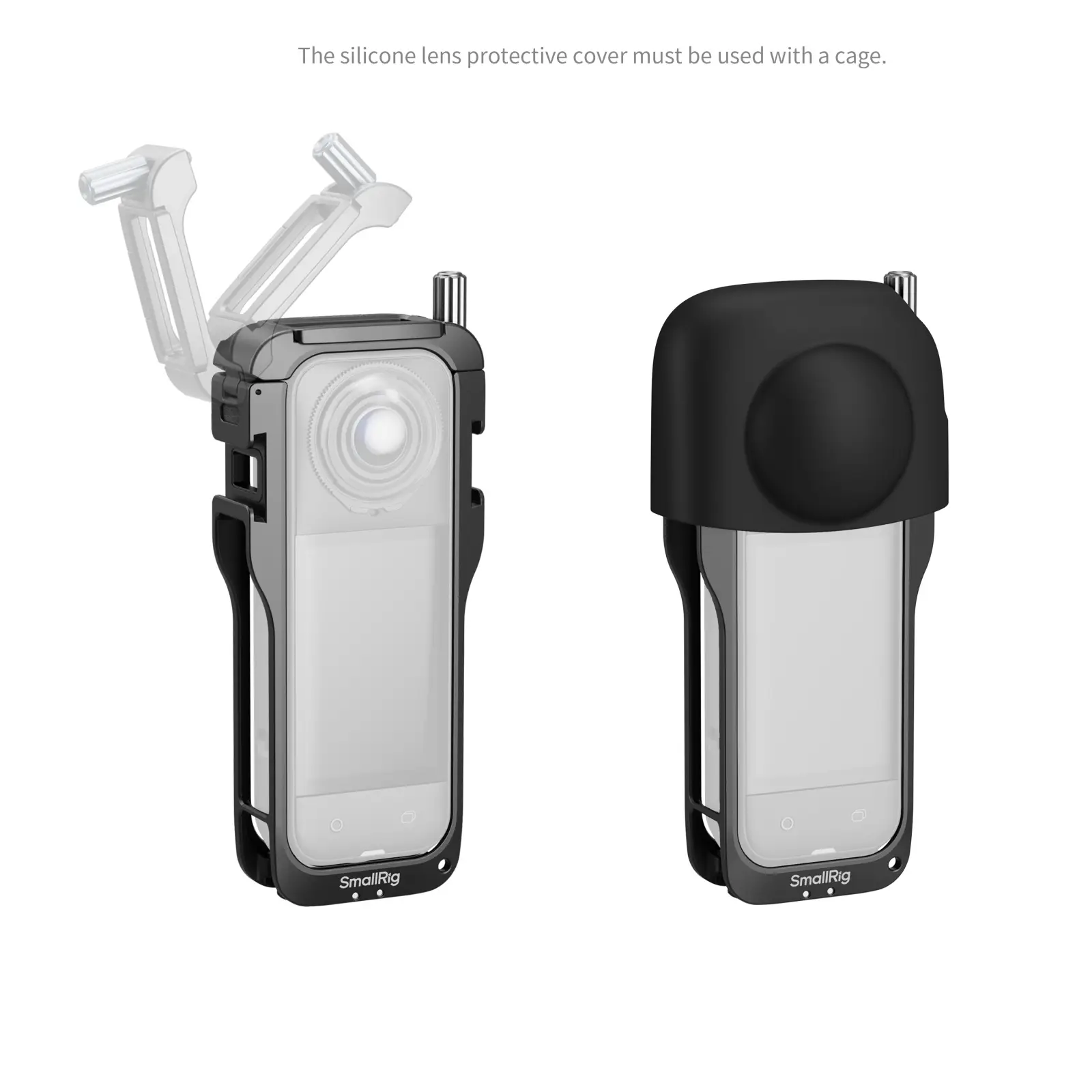 В дополнение к этому, с одной стороны предусмотрен "холодный башмак" и резьбовое отверстие 1/4", обеспечивающее надежное крепление микрофонов или осветительных приборов. Также на основании расположен складной держатель для экшн-камер и еще одно резьбовое отверстие 1/4" для установки штативов или селфи-палок. В комплект входит силиконовая крышка для объектива (применимая только с клеткой) для защиты объектива от царапин в процессе хранения.